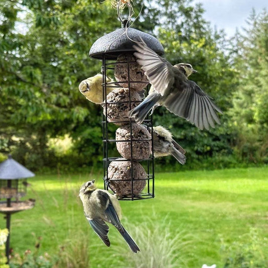 Stor, flot fuglefoderhus til frø med gitter - sort metal